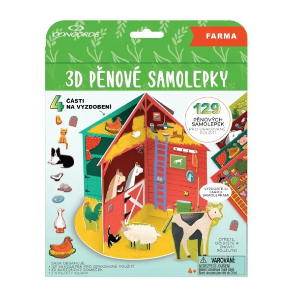 3D penové samolepky pre opakované použitie. Set krásnych samolepek a hracieho 3D kartónového domčeka s motívom farmy. Samolepky držia na hladkej ploche bez lepidla. Je možné ich teda opakovane používať a prelepovať na hracej ploche alebo na rôzne hladké miesta. Deti rozvíjajú jemnú motoriku a zároveň si užijú plno zábavy. Výborná aktivita pre vytváranie si vlastného zábavného sveta.