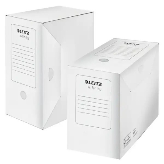 Špeciálny archivačný systém Leitz Infinity splňuje všetky kritériá a požiadavky medzinárodnej normy ISO 16245 pre dlhodobú a náročnú archiváciu dokumentov. Je vyrobený z novo vyvinutej lepenky, ktorá je 100% acid free (alkalická).Inovatívna konštrukcia rýchleho zloženia, ktorá šetrí čas a energiu, zložená za pár sekúnd. Odporúčané pre náročnú a dlhodobú archiváciu dokumentov v národných archívoch, múzeách, knižniciach aj v súkromných organizáciách. Šírka hrebeňa 150 mm. Pre formát dokumentov i dosiek A4.