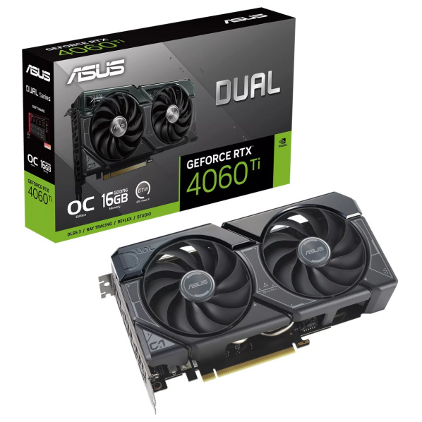 ASUS Dual GeForce RTX™ 4060 Ti OC Edition 16GB GDDR6 with two powerful Axial-tech fans and a 2.5-slot design for broad compatibility Powered by NVIDIA DLSS3, ultra-efficient Ada Lovelace arch, and full ray tracing 4th Generation Tensor Cores: Up to 4x performance with DLSS 3 vs. brute-force rendering 3rd Generation RT Cores: Up to 2x ray tracing performance OC edition: 2625 MHz (OC mode)/ 2595 MHz (Default mode) Axial-tech fan design features a smaller fan hub to increase airflow through the cooling array A 2.5-slot design maximizes compatibility and cooling efficiency for superior performance in small chassis. Dual ball fan bearings can last up to twice as long as sleeve bearing designs 0dB technology lets you enjoy light gaming in relative silence DUAL-RTX4060TI-O16G Graphic Engine NVIDIA® GeForce RTX™ 4060 Ti Bus Standard PCI Express 4.0 OpenGL OpenGL®4.6 Video Memory 16GB GDDR6 Engine Clock OC mode : 2625 MHz Default mode : 2595 MHz (Boost) CUDA Core 4352 Memory Speed 18 Gbps Memory Interface 128-bit Resolution Digital Max Resolution 7680 x 4320 Interface Yes x 1 (Native HDMI 2.1a) Yes x 3 (Native DisplayPort 1.4a) HDCP Support Yes (2.3) Maximum Display Support 4 NVlink/ Crossfire Support No Accessories 1 x Collection Card 1 x Speedsetup Manual 1 x Thank you Card Software ASUS GPU Tweak III & GeForce Game Ready Driver & Studio Driver: please download all software from the support site. Dimensions 227.2 x 123.24 x 49.6 mm 8.94 x 4.85 x 1.95 inches Recommended PSU 650W Power Connectors 1 x 8-pin Slot 2.5 Slot