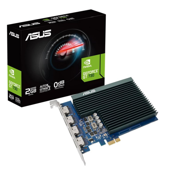 ASUS GeForce® GT 730 with 4 HDMI ports and passive cooling to enable quiet multi-monitor productivity. 4x HDMI Ports enable multi-monitor productivity on up to 4 displays. Single-slot Design fits in small chassis and leaves room for additional PCIe devices. Passive Cooling keeps things quiet. Auto-Extreme Technology uses automation to enhance reliability. GPU Tweak II provides intuitive performance tweaking, thermal controls, and system monitoring. Model ASUS GeForce® GT 730 Graphic Engine NVIDIA® GeForce GT 730 Bus Standard PCI Express 2.0 OpenGL OpenGL®4.6 Video Memory 2GB GDDR5 Engine Clock OC mode: 927 MHz (Boost Clock) Gaming mode: 902 MHz (Boost Clock) CUDA Core 384 Memory Speed 5010 MHz Memory Interface 64-bit Resolution Digital Max Resolution 3840 x 2160 Interface Yes x 4 (Native HDMI 1.4b) HDCP Support Yes (1.4) Maximum Display Support 4 NVlink/ Crossfire Support No Accessories 1 x Speedsetup Manual Software ASUS GPU Tweak II & Drivers: please download all software from the support site. Dimensions 148 x 105 x 18 mm 5.8 x 4.1 x 0.7 inches Recommended PSU 300W Power Connectors No Slot 1 Slot