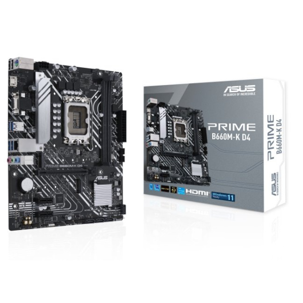 Intel® B660 (LGA 1700) mATX motherboard with PCIe® 4.0, two M.2 slots, DDR4, HDMI®, D-Sub, Realtek 1Gb Ethernet, front USB 3.2 Gen 1, ASUS Lighting Control Intel® LGA 1700 socket: Ready for 13th & 12th gen Intel® processors Enhanced power solution: 8-pin ProCool connector, alloy chokes and durable capacitors for stable power delivery Comprehensive cooling: VRM heatsink, PCH heatsink, hybrid fan headers and Fan Xpert Ultrafast connectivity: PCIe® 4.0, two M.2 slots and front USB 3.2 Gen 1 PRIME B660M-K D4 CPU Intel® Socket LGA1700 for Intel® Core™ 14th & 13th Gen Processors, Intel® Core™ 12th Gen, Pentium® Gold and Celeron® Processors Intel® Socket LGA1700 for Intel® Core™ 14th & 13th Gen Processors, Intel® Core™ 12th Gen, Pentium® Gold and Celeron® Processors* Supports Intel® Turbo Boost Technology 2.0 and Intel® Turbo Boost Max Technology 3.0** * Refer to www.asus.com for CPU support list. ** Intel® Turbo Boost Max Technology 3.0 support depends on the CPU types. Memory 2x DIMM, Max. 64GB, DDR4 5333(OC)/5000(OC)/4800(OC)/4600(OC)/4400(OC)/4266(OC)/4000(OC)/3733(OC)/3600(OC)/3466(OC)/3400(OC)/3333(OC)/3200/3000/2933/2800/2666/2400/2133 Non-ECC, Un-buffered Memory* Dual Channel Memory Architecture Supports Intel® Extreme Memory Profile (XMP) * Actual memory data rate depends on the CPU types and DRAM modules, for more information refer to www.asus.com for memory support list. Graphics 1 x HDMI 2.0 1 x D-Sub port 1 x HDMI® port** * Graphics specifications may vary between CPU types. Please refer to www.intel.com for any updates. ** Support 4K@60Hz as specified in HDMI® 2.1. Expansion Slots Intel® Core™ Processors (14th &13th & 12th Gen) 1 x PCIe 4.0/3.0 x16 slot Intel® B660 Chipset 2 x PCIe 3.0 x1 slots Storage Supports 2 x M.2 slots and 4 x SATA 6Gb/s ports Total supports 2 x M.2 slots and 4 x SATA 6Gb/s ports* Intel® Core™ Processors (14th &13th & 12th Gen) M.2_1 slot (Key M), type 2242/2260/2280 (supports PCIe 4.0 x4) Intel® B660 Chipset** M.2_2 slot (Key M), type 2242/2260/2280 (supports PCIe 4.0 x4) 4 x SATA 6Gb/s ports * Intel® Rapid Storage Technology supports SATA RAID 0/1/5/10. ** Intel® Rapid Storage Technology supports Intel® Optane Memory H Series on PCH attached M.2 slots. Ethernet 1 x Realtek 1Gb Ethernet ASUS LANGuard USB Rear USB:Total 6 ports 4 x USB 3.2 Gen 1 ports (4 x Type-A) 2 x USB 2.0 ports (2 x Type-A) Front USB:Total 6 ports 1 x USB 3.2 Gen 1 header supports additional 2 USB 3.2 Gen 1 ports 2 x USB 2.0 headers support additional 4 USB 2.0 ports Audio Realtek 7.1 Surround Sound High Definition Audio CODEC* - Supports: Jack-detection, Multi-streaming, Front Panel Jack-retasking - Supports up to 24-Bit/192 kHz playback" Audio Features - Audio Shielding - Premium audio capacitors - Dedicated audio PCB layers * A chassis with an HD audio module in the front panel is required to support 7.1 Surround Sound audio output. Back Panel I/O Ports 4 x USB 3.2 Gen 1 ports (4 x Type-A) 2 x USB 2.0 ports (2 x Type-A) 1 x D-Sub port 1 x HDMI® port 1 x Realtek 1Gb Ethernet port 3 x Audio jacks 1 x PS/2 Keyboard/Mouse combo port Internal I/O Connectors Fan and Cooling related 1 x 4-pin CPU Fan header 1 x 4-pin Chassis Fan header Power related 1 x 24-pin Main Power connector 1 x 8-pin +12V Power connector Storage related 2 x M.2 slots (Key M) 4 x SATA 6Gb/s ports USB 1 x USB 3.2 Gen 1 header supports additional 2 USB 3.2 Gen 1 ports 2 x USB 2.0 headers support additional 4 USB 2.0 ports Miscellaneous 1 x RGB header 1 x Clear CMOS header 1 x COM Port header 1 x Front Panel Audio header (AAFP) 1 x S/PDIF Out header 1 x Speaker header 1 x SPI TPM header (14-1pin) 1 x 10-1 pin System Panel header Special Features ASUS 5X PROTECTION III - DIGI+ VRM - LANGuard - Overvoltage Protection - SafeSlot Core - Stainless-Steel Back I/O ASUS Q-Design - Q-DIMM - Q-Slot ASUS EZ DIY - ProCool ASUS Thermal Solution - VRM heatsink design ASUS Lighting Control -RGB header Software Features ASUS Exclusive Software Armoury Crate AI Suite 3 - Performance And Power Saving Utility TurboV EVO EPU DIGI+ VRM Fan Xpert ASUS CPU-Z Norton Anti-virus software (Free Trial version) WinRAR UEFI BIOS ASUS EZ DIY - ASUS CrashFree BIOS 3 - ASUS EZ Flash 3 - ASUS UEFI BIOS EZ Mode BIOS 128 Mb Flash ROM, UEFI AMI BIOS Manageability WOL by PME, PXE Accessories Cables 2x SATA 6Gb/s cables Miscellaneous 1 x I/O Shield 2 x M.2 anchors Installation Media 1 x Support DVD Documentation 1 x User manual Operating System Windows® 11, Windows® 10 64-bit Form Factor microATX 24.4cm x 21.1cm