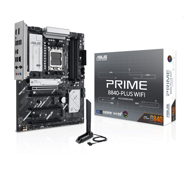Prime B840-PLUS WIFI ASUS Prime series motherboards are expertly engineered to unleash the full potential of AMD Ryzen™ 9000 series processors. The PRIME B840-PLUS WIFI motherboard provides users and PC DIY builders with a range of performance optimizations via intuitive software and firmware features. It’s designed to be Advanced AI PC-ready, offering the power and connectivity needed for demanding AI applications. PRIME B840-PLUS WIFI Please visit our GLOBAL website to check and download the latest updates. CPU AMD Socket AM5 for AMD Ryzen™ 9000 & 8000 & 7000 Series Desktop Processors* * Refer to https://www.asus.com/support/download-center/ for CPU support list. Chipset AMD B840 Chipset Memory 4 x DIMM slots, max. 256GB, DDR5 Supports up to 7600+MT/s (OC) with Ryzen™ 9000 & 8000 & 7000 Series Processors, ECC and Non-ECC Un-buffered DIMM* Dual channel memory architecture Supports AMD Extended Profiles for Overclocking (EXPO™) ASUS Enhanced Memory Profile (AEMP) * Supported memory types, data rate (speed), and number of DRAM modules vary depending on the CPU and memory configuration, for more information please refer to CPU/Memory Support list under the Support tab of product information site or visit https://www.asus.com/support/download-center/. Adjustments will be made based on the specifications of mass-produced memory products available on the market. * Non-ECC, un-buffered DDR5 memory supports On-Die ECC function. Graphics 1 x DisplayPort** 1 x HDMI™ port*** * Graphics specifications may vary between CPU types. Please refer to AMD CPU specifications. ** Supports max. 8K@30Hz as specified in DisplayPort 1.4. *** Supports 4K@60Hz as specified in HDMI 2.1. Expansion Slots AMD Ryzen™ 9000 & 7000 Series Desktop Processors* 1 x PCIe 4.0 x16 slot (supports x16 mode) AMD Ryzen™ 8000 Series Desktop Processors 1 x PCIe 4.0 x16 slot (supports x8/x4 mode)** AMD B840 Chipset 1 x PCIe 3.0 x16 slot (support x4 mode)*** 2 x PCIe 3.0 x16 slots (support x1 mode)*** 1 x PCIe 3.0 x1 slot*** * Please check the PCIe bifurcation table on the support site (https://www.asus.com/support/FAQ/1037507/). ** Specifications vary by CPU types. *** The PCIEX16(G3)_1/3 and PCIEX1(G3) share bandwidth with PCIEX16(G3)_2. The PCIEX16(G3)_2 will run x1 mode when any of the PCIEX16(G3)_1/3 and PCIEX1(G3) slots is occupied. - To ensure compatibility of the device installed, please refer to https://www.asus.com/support/download-center/ for the list of supported peripherals. Storage Supports 3 x M.2 slots and 4 x SATA 6Gb/s ports AMD Ryzen™ 9000 & 7000 Series Desktop Processors M.2_1 slot (Key M), type 2280 (supports PCIe 4.0 x4 mode) M.2_2 slot (Key M), type 2280 (supports PCIe 4.0 x4 mode) AMD Ryzen™ 8000 Series Desktop Processors M.2_1 slot (Key M), type 2280 (supports PCIe 4.0 x4 mode) M.2_2 slot (Key M), type 2280 (supports PCIe 4.0 x4/x2 mode)* AMD B840 Chipset M.2_3 slot (Key M), type 2242/2260/2280 (supports PCIe 3.0 x4 mode 4 x SATA 6Gb/s ports * Specifications vary by CPU types. AMD RAIDXpert2 Technology Ryzen™ 9000 Series Processors: RAID 0/1/5/10 Ryzen™ 8000 Series Processors: RAID 0/1 Ryzen™ 7000 Series Processors: RAID 0/1/10 Ethernet 1 x Realtek 2.5Gb Ethernet ASUS LANGuard Wireless & Bluetooth "Wi-Fi 6E 2x2 Wi-Fi 6E (802.11ax) Supports 2.4/5/6GHz frequency band* Bluetooth® v5.3** * WiFi 6E 6GHz regulatory may vary between countries, supported only in Windows 11 or later. ** The Bluetooth® version may vary, please refer to the Wi-Fi module manufacturer's website for the latest specifications." USB Rear USB (Total 8 ports) 2 x USB 10Gbps port(s) (1 x Type-A + 1 x USB Type-C®) 2 x USB 5Gbps ports (2 x Type-A) 4 x USB 2.0 ports (4 x Type-A) Front USB (Total 7 ports) 1 x USB 5Gbps connector (supports USB Type-C®) 1 x USB 5Gbps header supports 2 additional USB 5Gbps ports 2 x USB 2.0 headers support 4 additional USB 2.0 ports * USB Type-C® power delivery output: max. 5V/3A Audio Realtek 7.1 Surround Sound High Definition Audio CODEC* - Supports: Jack-detection, Multi-streaming, Front Panel Jack-retasking - Supports up to 24-Bit/192 kHz playback Audio Features - Audio Shielding - Premium audio capacitors - Dedicated audio PCB layers * A chassis with an HD audio module in the front panel is required to support 7.1 Surround Sound audio output. Back Panel I/O Ports 1 x USB 10Gbps port (1 x USB Type-C®) 1 x USB 10Gbps port (1 x Type-A) 2 x USB 5Gbps ports (2 x Type-A) 4 x USB 2.0 ports (4 x Type-A) 1 x DisplayPort 1 x HDMI™ port 1 x Wi-Fi module 1 x Realtek 2.5Gb Ethernet port 3 x Audio jacks 1 x BIOS FlashBack™ button Internal I/O Connectors Fan and Cooling Related 1 x 4-pin CPU Fan header 1 x 4-pin CPU OPT Fan header 1 x 4-pin AIO Pump header 4 x 4-pin Chassis Fan header Power Related 1 x 24-pin Main Power connector 1 x 8-pin +12V CPU Power connectors 1 x 4-pin +12V CPU Power connectors Storage Related 3 x M.2 slots (Key M) 4 x SATA 6Gb/s ports USB 1 x USB 5Gbps connector (supports USB Type-C® ) 1 x USB 5Gbps header supports 2 additional USB 5Gbps ports 2 x USB 2.0 headers support 4 additional USB 2.0 ports Miscellaneous 3 x Addressable Gen 2 headers 1 x Clear CMOS header 1 x Chassis Intrusion header 1 x COM Port header 1 x Front Panel Audio header (F_AUDIO) 1 x S/PDIF Out header 1 x SPI TPM header (14-1 pin) 1 x 10-1 pin System Panel header 1 x Thunderbolt™ (USB4®) header Special Features ASUS 5X PROTECTION III - DIGI+ VRM - LANGuard - Overvoltage protection - SafeSlot core+ - Stainless-steel back I/O ASUS Q-Design - Q-Antenna - Q-Dashboard - Q-DIMM - Q-LED Core - Q-Slot ASUS Thermal Solution - Flexible M.2 heatsink - VRM heatsink design ASUS EZ DIY - BIOS FlashBack™ button - BIOS FlashBack™ LED - Pre-mounted I/O shield - SafeSlot core+ Aura Sync - Addressable Gen 2 headers Software Features ASUS Exclusive Software Armoury Crate - Aura Creator - Aura Sync - Fan Xpert 2+ - Power Saving ASUS Driver Hub ASUS GlideX TurboV Core ASUS CPU-Z Adobe Creative Cloud (Free Trial) No