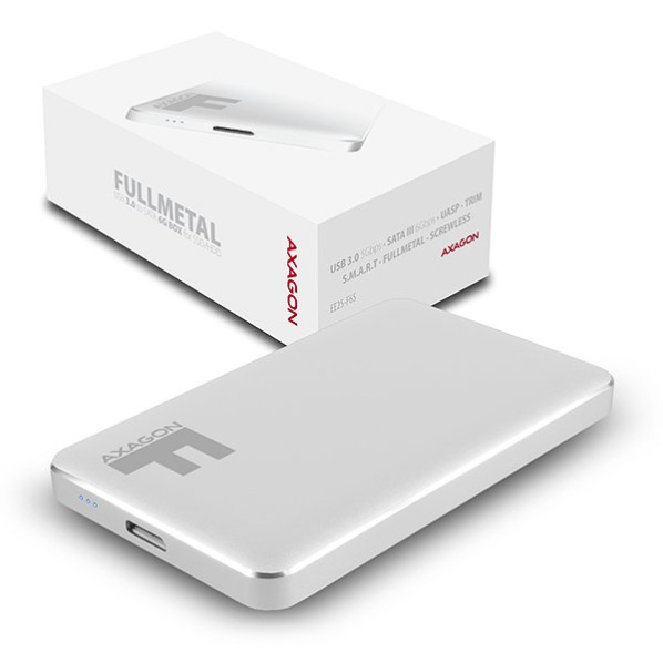 Celokovový externý box AXAGON EE25-F6S Fullmetal SILVER s USB 3.0 a SATA 6G rozhraním určený pre 2.5" SATA pevné disky alebo SSD. Rýchla a jednoduchá výmena diskov v boxe bez potreby skrutkovania rozširuje možnosti využitia napr. pre migráciu dát, testovanie atď. Aktuálne SATA III/6G rozhranie s podporou UASP dovolí užívať si rýchlosť moderných SSD diskov. Podpora funkcie TRIM pre obmedzenie pozvoľné degradácie výkonu SSD v čase. Čítanie S.M.A.R.T. informácií monitorujúcich kondíciu externého disku. Podpora uspávanie pripojených diskov aj boxu. Ľahká a zároveň odolná celohliníková skriňa pre dokonalú mechanickú ochranu disku a výborný odvod tepla. Zaoblený luxusný design skrine s matným povrchom sľubuje príjemné používanie a bráni nežiadúcim odtlačkom prstov. Vlastnosti: • Kompatibilný s USB 3.1 gen 1 / USB 3.0, spätne kompatibilný s USB 2.0. • Podpora prenosových rýchlostí 12 / 480 / 5000 Mbit/s (full / high / super speed). • Podpora 2.5" SATA III/II/I diskov výšky max. 9.5 mm všetkých kapacít bez obmedzenia. • Vyhovuje Serial ATA 3.1 špecifikácii (SATA/600), prenosové rýchlosti až 6 Gb/s. • Vyhovuje Serial ATA 2.0 špecifikácii (SATA/300), prenosové rýchlosti až 3 Gb/s (300 MB/s). • Vyhovuje Serial ATA 1.0 špecifikácii (SATA/150), prenosové rýchlosti až 1.5 Gb/s (150 MB/s). • Celková priepustnosť / prenosová rýchlosť boxu je daná použitým USB 3.0 rozhraním (teor. 5 Gbit/s). • Podpora UASP (USB Attached SCSI Protocol). • Podpora bootovanie z SSD/HDD v externom boxe. • Možnosť pripojenia zariadenia za chodu vďaka podpore Hot Plug. • Plná podpora Plug and Play. • HDD Auto Spindown - automatické uspanie disku pri nečinnosti trvajúcej 10 minút. • HDD Turn Off - vypnutie disku po odobratí zariadení alebo uspanie PC. • Pripojenie cez USB 3.0 micro B female konektor. • USB 3.0 kábel USB 3.0 type A male / USB 3.0 micro B male dĺžky 60 cm súčasťou balenia. • Napájanie po USB 3.0 zbernici až 900mA z jedného USB portu úplne dostačuje vo všetkých prípadoch. • Decentná modrá LED indikácia pripojenia k USB portu počítača (trvalým svitom) a prenos dát (blikaním). • Hliníkové telo s rýchlou bezskrutkovou montážou disku - stačí odomknúť zámok krytu boxu, vložiť disk, zatvoriť kryt a zamknúť zámok. Ďalšie údaje: • Rozmery 129 x 78 x 15 mm. • Hmotnosť externého boxu 89 g (bez USB kábla a disku). Podporované operačné systémy: MS Windows XP / Vista / 7 / 8 / 8.1 / 10 a novšie, Windows Server 2003 / 2008 / 2012 / 2016 a novšie (podporované všetky 32- i 64-bitové verzie OS Windows), Mac OS X 10.x a vyšší, Linux s jadrom 2.6.x a vyšším. Pozn.: Ovládače sú súčasťou podporovaných operačných systémov a nainštalujú sa celkom automaticky. Žiadne iné ovládače nie je potrebné inštalovať a nie sú ani k dispozícii. Balenie v kartónovej krabičke s prehľadne uvedenými parametrami obsahuje: • USB 3.0 2.5" externý box v striebornej farbe, • USB 3.0 kábel dĺžky 60 cm, • tlačený multijazyčný manuál ENG/CZ/DE/ESP/FR/HU/IT/PL/RO/RU/SK.