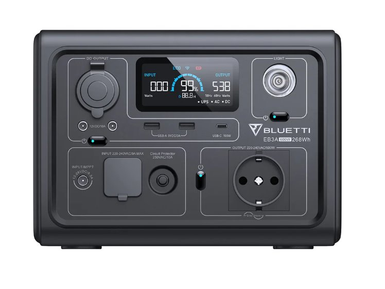 ROZBALENÉ VYSTAVENÉ ZAŘÍZENÍ - KOMPLETNÍ BALENÍ VČ.VEŠKERÉHO PŘÍSLUŠENSTVÍ A MANUÁLŮ A PLNÉ ZÁRUKY BLUETTI EB3A Portable Power Station | 600W 268Wh 600W AC Pure Sine Wave Inverter (1,200W surge); 268Wh Capacity; 430W Max. Fast Dual Charging (Solar+AC); LiFePO4 Battery with 2,500+ Life Cycles to 80%; 6 Ways to Recharge (AC/Solar/Car/Generator/AC+Solar/AC+Adapter); 8 Outputs for Charging Multiple Devices at once; Smart Control & Monitor in BLUETTI App; 200W Max. Solar Input; Easy to Carry/ Fast Charging/ Safe & Reliable/ Cost-effective