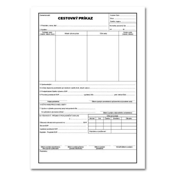 Popis výrobku Cestovný príkaz – A4, 70g biely papier / 100 ksBaleniebal / 100 har.FormátA4Tlačivá účtovné a daňové