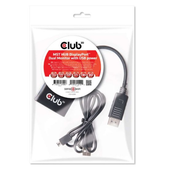Club 3D Multi Stream Transport (MST) Hub DisplayPort 1.2 Dual Monitor (Polybag) SPECIFICATIONS Model Product Name:Multi Stream Transport (MST) Hub DisplayPort™ 1.2 Dual Monitor USB Powered Product Series: Video Splitters Itemcode: CSV-6200 EAN code: 8719214470906 UPC code: 841615101092 Features: • Compliant with: DisplayPort™ v1.2a, DisplayPort™ v1.1a, VESA DDM Standard, HDCP V2.0, Display Id,and EDID V1.4 • Supports main link rates of 5.4 Gbps (HBR2), 2.7Gbps (HBR) and 1.62Gbps (RBR) from source • Input pixel dat a depth 6/8/10/12 bits and supports output pixel format RGB444 • Supports Advanced Wide Eye SerDes technology enables high Jitter performance • Dual Monitor setup resolution up to 2x 2560X1600p @ 60Hz • Supports AMD Eyefinity™ • Compatible with Microsoft Surface Pro and Intel NUC platforms • Works with AMD, Nvidia and Intel Graphics solutions Note Some Notebooks/Tablets/MiniPC's have Integrated Graphics Chips which do not support more than 3 screens in total. Please consult with your device specifications for further information. OS Support: Microsoft Windows 10/ 8.1 Input: DisplayPort™ 1.2 Male Micro USB Female for Power Output: 2x DisplayPort™ Female Other info: • Hub size LxWxD: 61 x 49 x 12 mm • Hub Weight: 54 gr. • Cable Length USB: 1000 mm • Cable Weight USB: 22 gr. • Cable Length DP: 180 mm • Poly Bag: 160x 240 mm. • Poly Bag Weight: 9 gr.