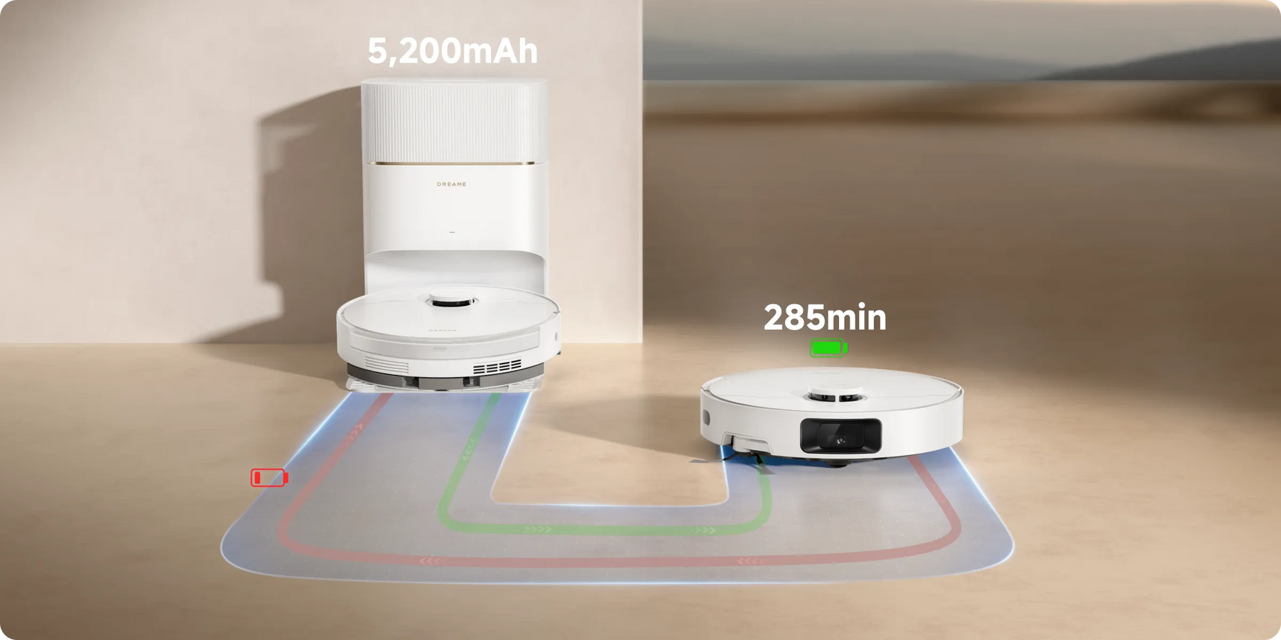 Vychutnajte si dlhšie čistenie s našou veľkou batériou, ktorá ponúka dlhší čas prevádzky. Keď sa energia vybije, vysávač sa sám dobije a pokračuje v práci.