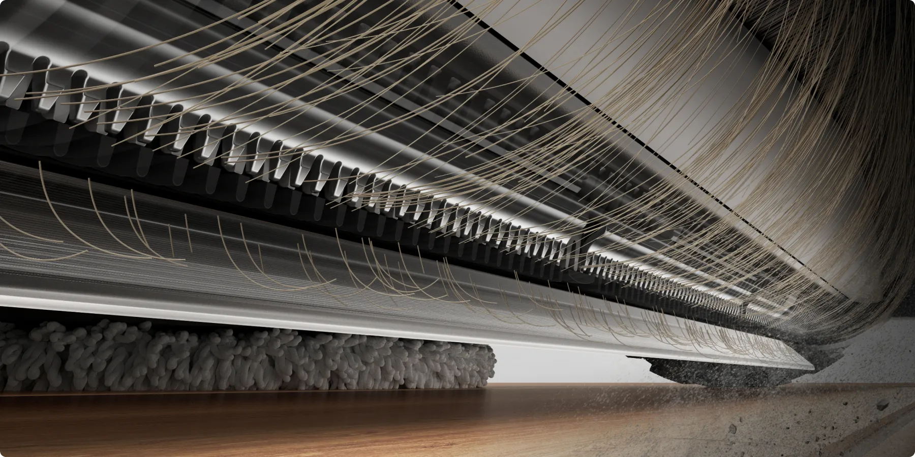Kefa TriCut je vybavená tromi bezpečne navrhnutými strihacími hlavami na valčekovej kefe, ktoré zabraňujú upchatiu prestrihnutím vlasov a ich vedením do nádoby na prach, čím znižujú problémy spojené s ručným čistením.