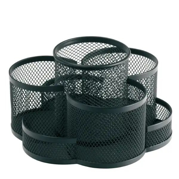 Drôtený stojan na rôzne kancelárske potreby, spony, perá a ceruzky a pod. Protišmykové nožičky a otočný mechanizmus. Rozmery: priemer 170 mm, výška 100 mm.