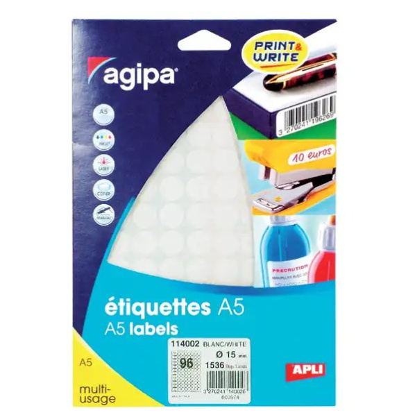 Popis výrobku Etikety PRINT kruh 8 mm, bieleBalenie16 har. / balPočet hárkov v balení16FarbabielaRozmery8 mmTypKruhovéPočet etikiet na hárku294Počet etikiet v balení4704Kruhové univerzálne biele etikety na formáte A5 pre atramentovú aj laserovú tlač.