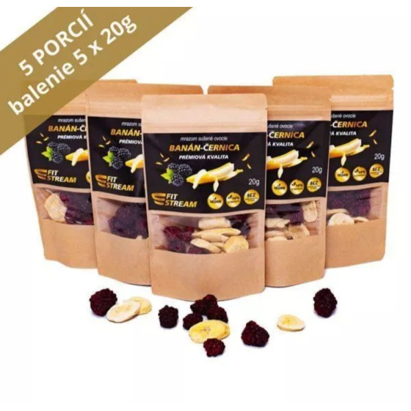 Fit balíčky FitStream obsahujú 100% mix mrazom sušeného ovocia. Mrazom sušené (lyofilizované) ovocie je 100% čisté ovocie sušené v špeciálnych komorách pri teplote -60° C vo vákuu, z ktorého je odstránená voda. Je takmer identické s čerstvým ovocím. Zachováva si až 98% výživových hodnôt čerstvého ovocia. V procese lyofilizácie spracovávame iba prémiové ovocie najvyššej akosti. Na výrobu 1kg mrazom sušeného ovocia FitStream je potrebné spracovať 8-10 kg čerstvého ovocia. Mrazom sušené ovocie nemá takmer žiadne požiadavky na skladovanie. Je ideálne pre použitie s mixérom FitStream, aby ste si Vaše obľúbené smoothie, sorbety, miešané proteínové nápoje a detskú stravu mohli vychutnať kdekoľvek. Ovocie je vhodné aj do müsli, jogurtov alebo sa konzumuje priamo ako chrumkavý snack výraznej ovocnej chuti a vône. Mrazom sušené ovocie FitStream je RAW, bez pridaného cukru, konzervantov, vhodné pre vegánov, GMO FREE, s vysokým obsahom vitamínov. Váha: 100g odhadovaný počet porcii: 5