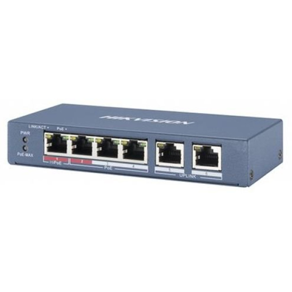 Popis výrobku Hikvision DS-3E0106HP-E - PoE switch 1 × 10/100 Mbps Hi-PoE 3 × 10/100 Mbps PoE 2 × 10/100 Mbps RJ45 1x 100M uplink Prepäťová ochrana 6 KV pre porty PoE. forwarding rate- 0.74Mpps Extended režim - do 250m - 10Mbps (Cat 5e)