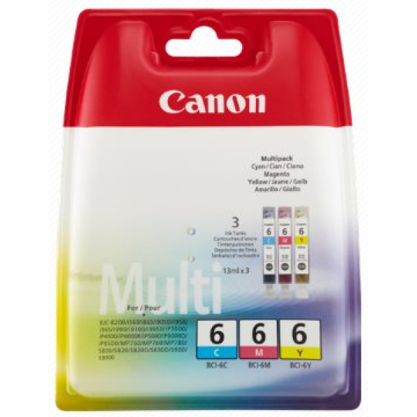 atramentové náplne CANON BCI-6 pre zariadenia: PIXMA iP4000/4000R/5000/6000/8500, PIXMA MP750/780, Bubble Jet i9950 kapacita 3 x 390 strán pri 5% pokrytí A4, kit obsahuje 3 farby C, M, Y