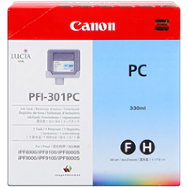 Popis výrobku kazeta CANON PFI-301PC photo cyan iPF 8000/8000s/8100/9000/9000s/9100 (330ml)Atramentová kazeta CANON PFI-301PC photo cyan pre iPF 8000/8000s/8100/9000/9000s/9100 iPF 8x00/s, 9x00/s 330ml, Pigment