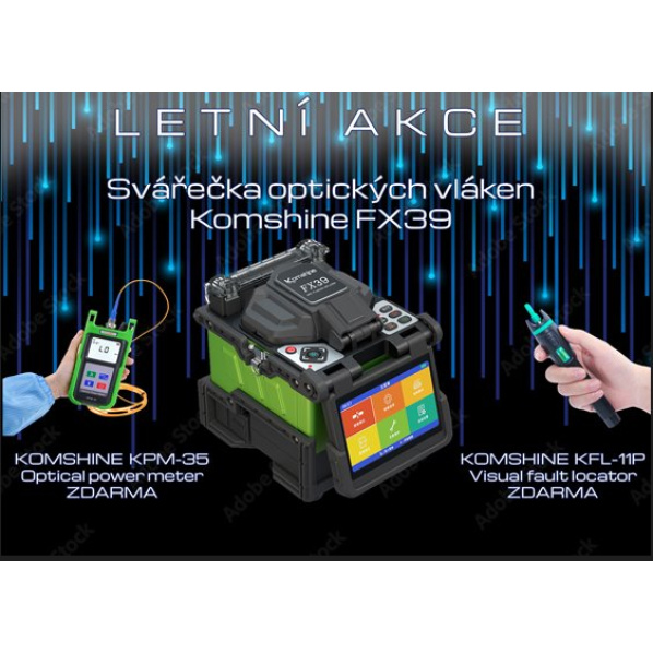 Akce - Sada svářečky optických vláken FX39 a Power Meteru/Fault locatoru KPV-53 za ještě nižší cenu než obvykle! Svářečka FX39: https://www.komshine.com/products/fusion-splicer/fx39-optica-fiber-fusion-splicer.htm PowerMeter KPV-53: https://www.komshine.com/products/fiber-optic-otdr/kpv-53.html Visual Fault Locator KFL-11P: https://www.komshine.com/test/kfl-11p.html Nový 3D model svářečky optických vláken. Svářečka vybavena 6 motory pro přesné zarovnání vlákna a bateriíí s kapacitou 7800 mAh pro dkouhý provoz. Inovovaný model dále vyniká • krátkou dobou svařování ( 6s ) • životností elektrod ( 5000 svárů ) • rychlostí nahřívání ( 16s ) • vysokou kapacitou baterie ( 400 svárů na jedno nabití v závislosti na teplotě a tlaku okolí ) • bezkonkurenčním poměrem cena/výkon ( svářecí komfort a kvalita odpovídá svářečkám v řádech cenově dražším) Přidaná hodnota díky nákupu z oficiální distribuce • jazyková lokalizace obslužného menu v češtině • garance kvality zpracování i výstupu díky ISO certifikátu jehož je výrobce držitelem • výrobce vám prostřednictvím naší společnosti nabízí aktualizovanou technickou podporu • poskytujeme odborný servis pod supervizí výrobce a dostupnost elementárních náhradních dílů • disponujeme kompletní technickou dokumentací k produktu včetně test reportů a příslušných certfifikátů • v případě vašeho zájmu nabízíme možnost zaškolení k obsluze svářečky, v případě nákupu jej poskytujeme zdarma Technické parametry, pořizovací cena a oficiální technická podpora činí z této svářečky ideálního pomocníka při výstavbě a servisu optických sítí. TECHNICKÉ SPECIFIKACE Metoda zarovnání: jádro na jádro Podporovaná vlákna: SM (ITU-TG.652&G.657) /MM (ITU-TG.651)/DS(ITU-TG.653)/NZDS(ITU-TG.655) Typ vlákna: Výměna univerzálního upevňovacího prvku, upevňovací prvek SOC (volitelný) Průměr vlákna / průměr pláště: 0-150 µm, průměr pláště: 100~1000 µm Délka řezu: ~16 mm Mody svařování: max. 128 režimů Standardní útlum sváru: SM:0,02dB/MM:0,01dB/DS:0,04dB/NZDS:0,04dB/G.657:0,02dB?? Zpětná ztráta: >60dB Doba pro svár: 6 sekund (SM G652 QUICK mode) Odhad útlumu: Ano Doba zahřívání: 16 sekund (SM G652 250um 40mm ochrana sváru, na základě rychlého režimu) nastavitelná uživatelem Použitelná délka ochrany sváru: 20 mm, 30 mm, 40 mm, 50 mm, 60 mm Režim ohřevu: max. 32 režimů Kapacita baterie: 7800 mAh Lithiová baterie, každý cyklus až 400 krát svaření a zapékání Životnost elektrod: 5 000 Automatická kalibrace vybíjení: Automatická kalibrace v závislosti na změnách okolní teploty a tlaku vzduchu Ukládání výsledků: 10000 výsledků o svařování nebo 100 snímků sváru Tahová zkouška: 1,96 ~ 2,25 N Provozní podmínky: nadmořská výška:0~5000 metrů, relativní vlhkost: 0~95 %, -20~50, maximální rychlost větru: 15 m/sekundu Displej: 4,3 palce, displej LCD s vysokým rozlišením Zvětšení a zobrazení X, Y, XY, X/Y: 320násobné zvětšení Hmotnost: 1,72 kg bez baterie/2,25 kg s baterií Rozměry: 158Vx132Šx157Dmm (včetně gumové ochrany) Port USB: 2.0 Obsah balení: Přenosný kufr s montážní deskou a transportním popruhem s karabinami Svářečka optických vláken Lámačka optických vláken Náhradní elektrody 2x Stripovací kleště Bezprašné ubrousky Lahvička na isopropyl Baterie 7800 mAh Napájecí zdroj KOMSHINE KPV-53 optical power meter (SM/MM) + Visual Fault Locator Navrženo pro všechny aplikace FTTx Integruje měřič optického výkonu a vizuální vyhledávač poruch. Spolehlivé základní funkce pro co nejekonomičtější testování Optický měřič výkonu dokáže měřit dBm, dB a uW v pásmu vlnových délek 850, 980, 1300, 1310, 1490,1550 a 1625nm. Vizuální vyhledávač poruch používá režim CW a režim modulace a pomáhá detekovat optický kabel o délce až 10 km. https://www.komshine.com/products/fiber-optic-otdr/kpv-53.html