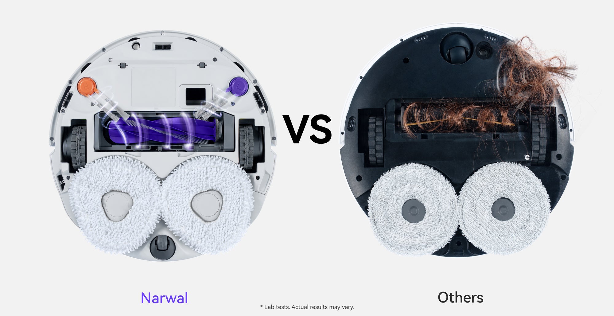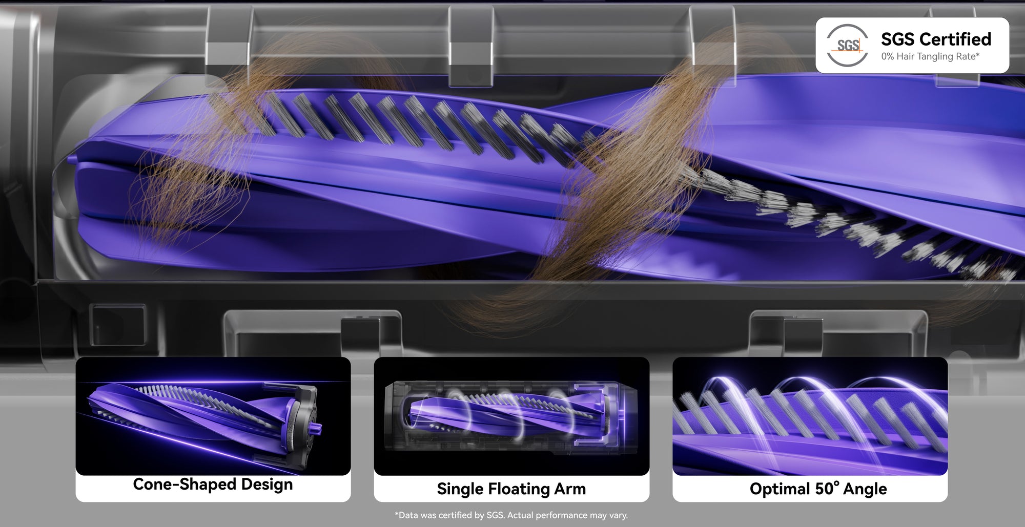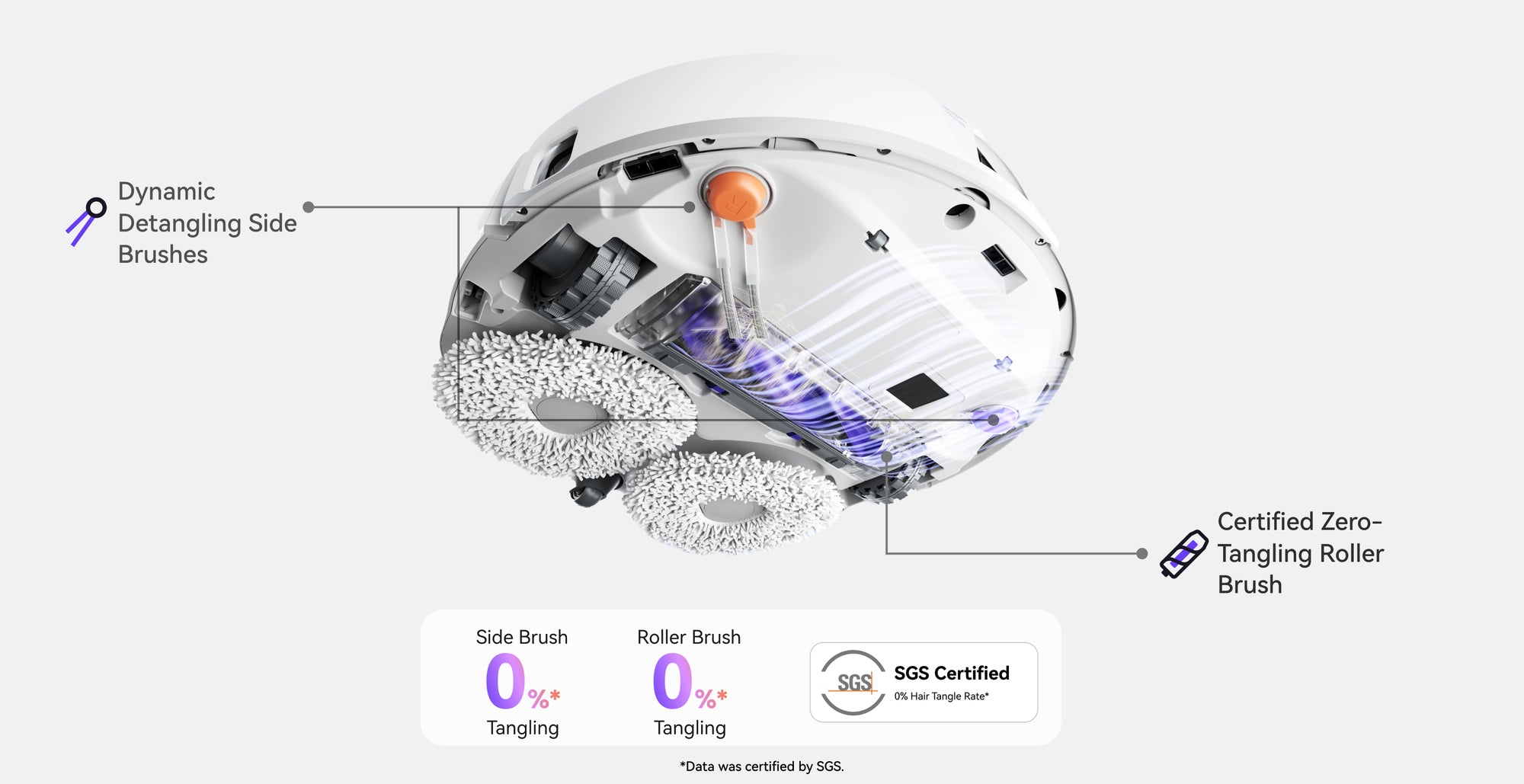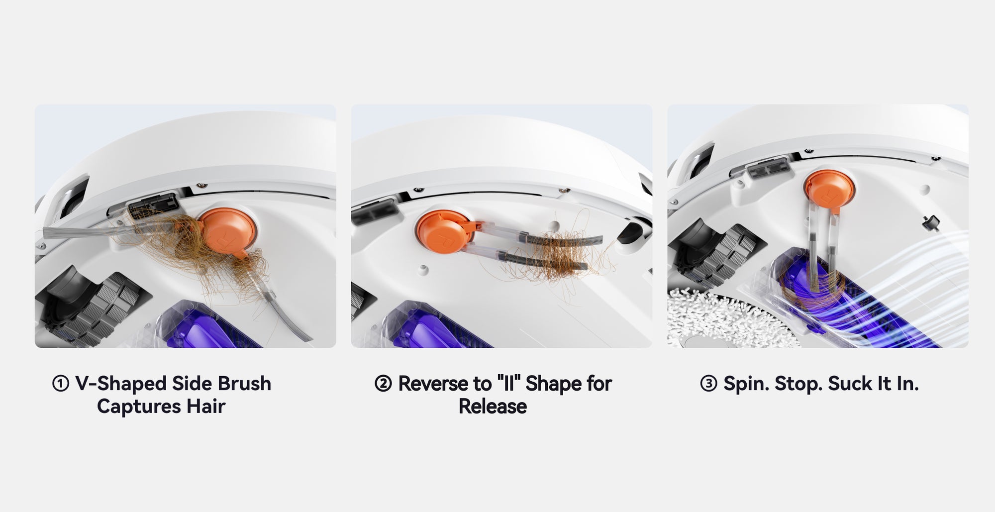 Dynamické bočné kefy sa menia z tvaru „V“ na tvar „II“ a upravujú svoj uhol, aby aktívne uvoľnili zamotané vlasy a zabezpečili skutočne čistenie bez zamotania.