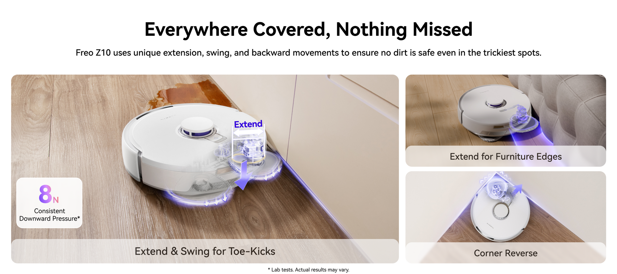 Freo Z10 používa unikátne jedinečné, predlžovacie a rotačné pohyby, ktoré zabezpečia, že žiadna nečistota nebude v bezpečí ani na tých najzložitejších miestach.