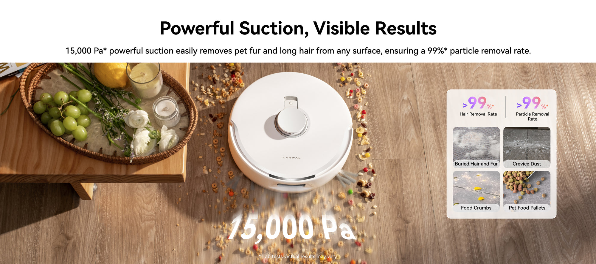 15 000 Pa* sací výkon jednoducho odstráni zvieracie chlpy a dlhé vlasy z akéhokoľvek povrchu a zabezpečí až 99%* mieru odstránenia častíc.