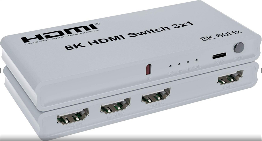 PremiumCord 8K@60Hz, 4K@144Hz HDMI switch 3:1 s dialkovým ovládacom 3 HDMI zariadenia na vstupe zdielajú 1 výstupný monitor, projektor. Výber vstupných zariadení: 1.automaticky, 2.stlacením tlacidla na cele prepínaca, 3.dialkovým ovládacom - Výber vstupu/dialkovým ovládaním - Podpora najvyššieho rozlíšenia videa 8K @ 60Hz, 8K @ 30Hz, 4K @ 144Hz, 4K @ 60Hz, 4K @ 30Hz (3840x2160/60Hz), FULL HD 1080p @ 60Hz - Vstupné konektory: 3x HDMI samica - Výstupný konektor: 1x HDMI samica - Podpora 3D - Podpora HDCP 2.2, HDCP2.3 a HDCP1.4 - Podporuje VRR, ALLM, FreeSync, G-sync - Umožnuje funkciu automatického prepínania - Podpora video formátu: 8/10/12 bitovej farby - Podpora HDR - Podpora zobrazenia s jedným a vysokým rozlíšením pre viac zdrojov, ako sú DVD, prehrávace, A/V prijímace a set top boxy - Napájací adaptér 230V, DC 5V/1A súcastou setu - Podpora formátu zvuku: DTS-HD/Dolby-trueHD/DTS/Dolby-AC3/DSD - Maximálna prenosová rýchlost: 40Gbps - Maximálny pracovný prúd: 500mA - Rozsah prevádzkových teplôt: -15 °C až +55 °C - Rozmery (D x Š x V): 123x56x15 (mm) - Hmotnost: 69g - Balenie v papierovej krabicke s napájacím adaptérom - Farba: šedá