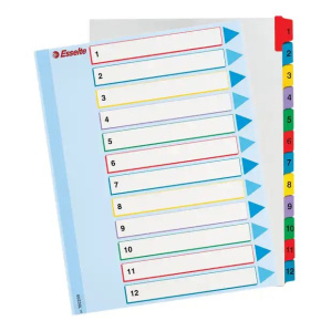 Plastový farebný rozlišovače Esselte, A4 Maxi - 10 listov. 10 farebných rozlišovacích listov pre rýc