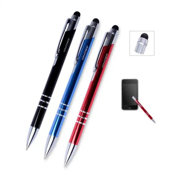 Guličkové pero CONCORDE Soft - dotykové je vhodné i pre obsluhu mobilných telefónov a tabletov. Má celokovové telo s pochrómovanými doplnkami. Klikací mechanizmus. Dostupné v mixe troch farieb: červená, modrá a čierna. Ozdobou sú 3 strieborné prstene v spodnej časti guličkového pera.