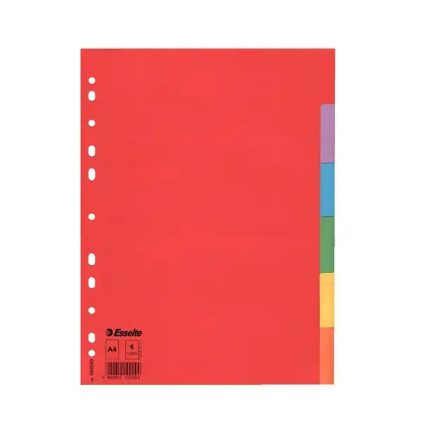 Rozraďovače formátu A4 z kvalitného, silného kartónu, bez titulnej popisovateľnej strany. Jednotlivé stránky v rôznych farbách, multiperforácia umožňuje použitie rozlišovača v krúžkovom aj pákovom poradači. 6-dielny.