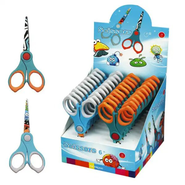 Školské nožnice s mäkkým úchopom. 15 cm. Dvojfarebné rukoväte v atraktívnych kombináciách farieb v modernom dizajne. Bezpečná guľatá špička. Dodávané v balení 20 ks. v 2 farebných prevedeniach - Pirát a Graffiti