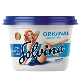 Solvina original, tradičná pilinová umývacia pasta s vysokým umývacím účinkom, čistí hlboko do pórov, dôkladne odstraňuje odolné nečistoty z pokožky (oleje, tuky, mazivá, sadze, grafit a ďalšie), obsahuje glycerín, bez silikónov a rozpúšťadiel, parfum s vôňou ihličia, balenie 450 g.