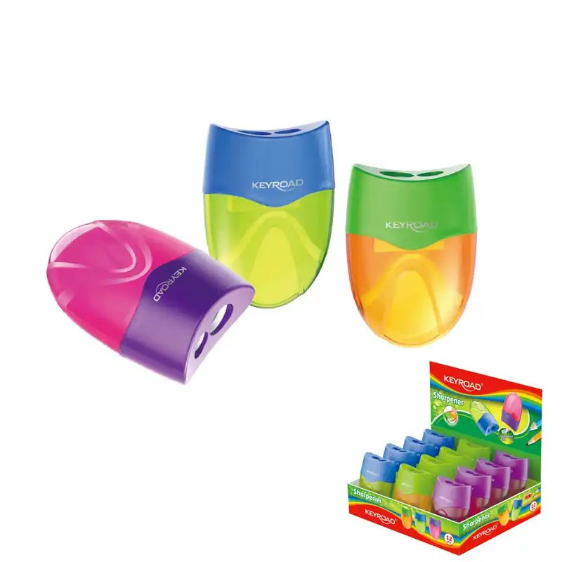 Pestrofarebné plastové strúhadlo s priehľadným kontajnerem pre viditeľné množstvo odrezkov.