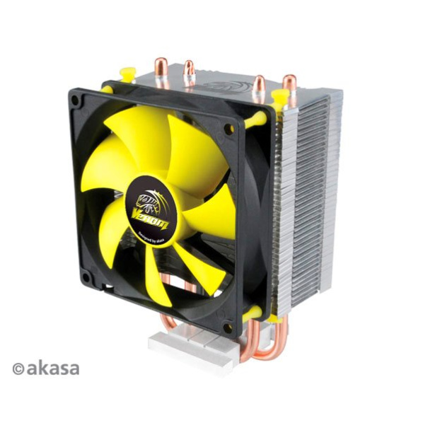 Venom Pico, Compact performance multi platform cooler, 2HP Direct contact, 92mm PWM Killer Viper Yellow fan Socket type Intel LGA775, LGA1150, LGA1151, LGA1155, LGA1156, LGA1200 AMD Socket AM2, AM2+, AM3, AM3+, AM4, FM1, FM2 & FM2+ Cooler dimensions 138.5 (H) x 94 (W) x 76 (D) mm Heatsink material High grade aluminium fins, copper heatpipes Heatpipe 6mm x 2 Weight 364g Installation Push-pins (Intel) or Screws (AMD) Fan dimension O92 x 25mm Fan speed 600 – 3000 RPM (PWM controlled) Max airflow 57.92 CFM Max air pressure 5.62 mm H2O Noise level 34.2 dB(A) Voltage rating 12V DC Bearing type EBR Fan life expectancy 40,000 hours Fan connector 4pin PWM Product code AK-CC4009EP01