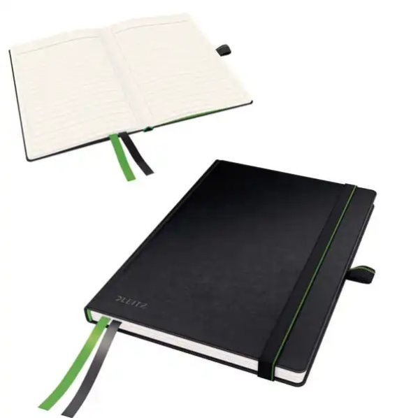 Prémiový zápisník v preslávenej kvalite značky Leitz. Moderný dizajn pre každodenné zhotovovanie poznámok. Atraktívny kožený vzhľad (syntetická koža) je príjemný na dotyk. Inovatívne prvky zaistia optimálnu organizáciu vašich poznámok. Dokonale doplňuje ostatné výrobky z radu Leitz Complete.Farba:Čierna.Uzatváranie na gumičku dodáva zápisníku atraktívny vzhľad a drží ho pevne zatvorený.Vďaka úchytu na pero budete mať písacie potreby vždy poruke.Obsahuje 2 textilné záložky pre rýchle nájdenie dôležitých stránok.Posledných 8 strán perforovaných pre jednoduché oddelenie samostatných kartičiek na poznámky.Samolepiace záložky na zadnej strane pre označenie dôležitého obsahu.Vnútorný obal s rozšíriteľnou kapacitou na prednej a zadnej strane zápisníka na uloženie voľných papierov a ďalších drobností.Kvalitný papier 96 g/m? s FSC® certifikáciou, 80 listov.Produkt radu Complete s FSC® certifikáciou.