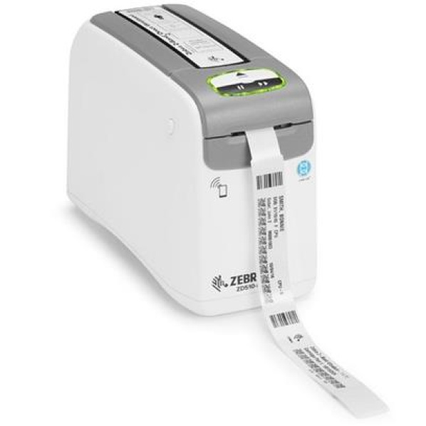 Zebra DT Printer ZD510 Wristband; ZPL II, XML, 300 dpi, EU and UK Cords, USB, USB Host, Ethernet, 802.11, BT wristband printer, healthcare, direct thermal, 12 dots/mm (300 dpi), print width (max.): 30 mm, speed (max.): 102 mm/s, USB, Bluetooth, Ethernet, Wi-Fi (802.11ac), ZPLII, XML, RAM: 256 MB, Flash: 512 MB, real time clock, incl.: power supply unit, power cable (EU, UK) TISK Print technology Direct thermal Print speed 102 mm/sec Maximum printing width 30.16 mm Colour No MOŽNOSTI PRIPOJENÍ Connectivity technology Wired & Wireless Ethernet LAN Yes USB port Yes USB 2.0 ports quantity 2 Optional connectivity Wireless LAN Bluetooth Yes VÝKON Built-in barcodes CODABAR (NW-7),Code 11,Code 39,Code 93,Code-128 Codabar Library,EAN128,EAN13,EAN8,GS1 DataBar,Interleaved 2/5,UPC-A,UPC-E Flash memory 256 MB Internal memory 512 MB Page description languages ZBI VZHLED Product colour White Display No PRÍKON AC input voltage 100 - 240 V AC input frequency 50 - 60 Hz PROVOZNÍ PODMÍNKY Operating temperature (T-T) 4.4 - 40 °C Operating relative humidity (H-H) 20 - 85 % Storage temperature (T-T) -40 - 60 °C Storage relative humidity (H-H) 5 - 85 % HMOTNOST A ROZMERY Weight 1400 g Height 178 mm Width 127 mm Depth 242 mm ÚDAJE O BALENÍ Quantity per pack 1 pc(s) LOGISTICKÁ DATA Harmonized System (HS) code 84433210 TECHNICKÉ DETAILY Sustainability certificates ENERGY STAR DALŠÍ CHARAKTERISTIKY LED indicators Yes