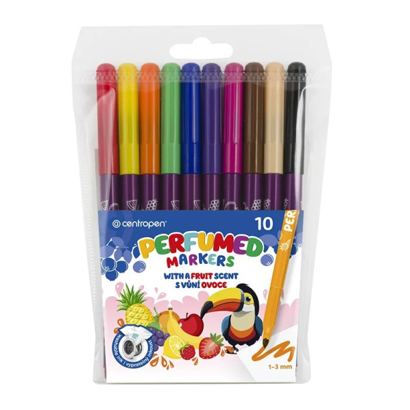 Sada 10ks parfémových značkovačov s ERGO držaním, ktoré obsahujú zdraviu neškodlivý atrament s vôňou ovocia. Disponujú ventilačným vrchnákom, valcovým hrotom a ich šírka stopy je 2-3 mm.