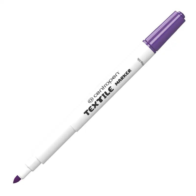 Fialový značkovač na textil s ERGO držaním, ktorý má zdraviu neškodlivý atrament, ventilačný vrchnák a valcový hrot. Je svetlostály, nevyprateľný a jeho šírka stopy je 1,8 mm.
